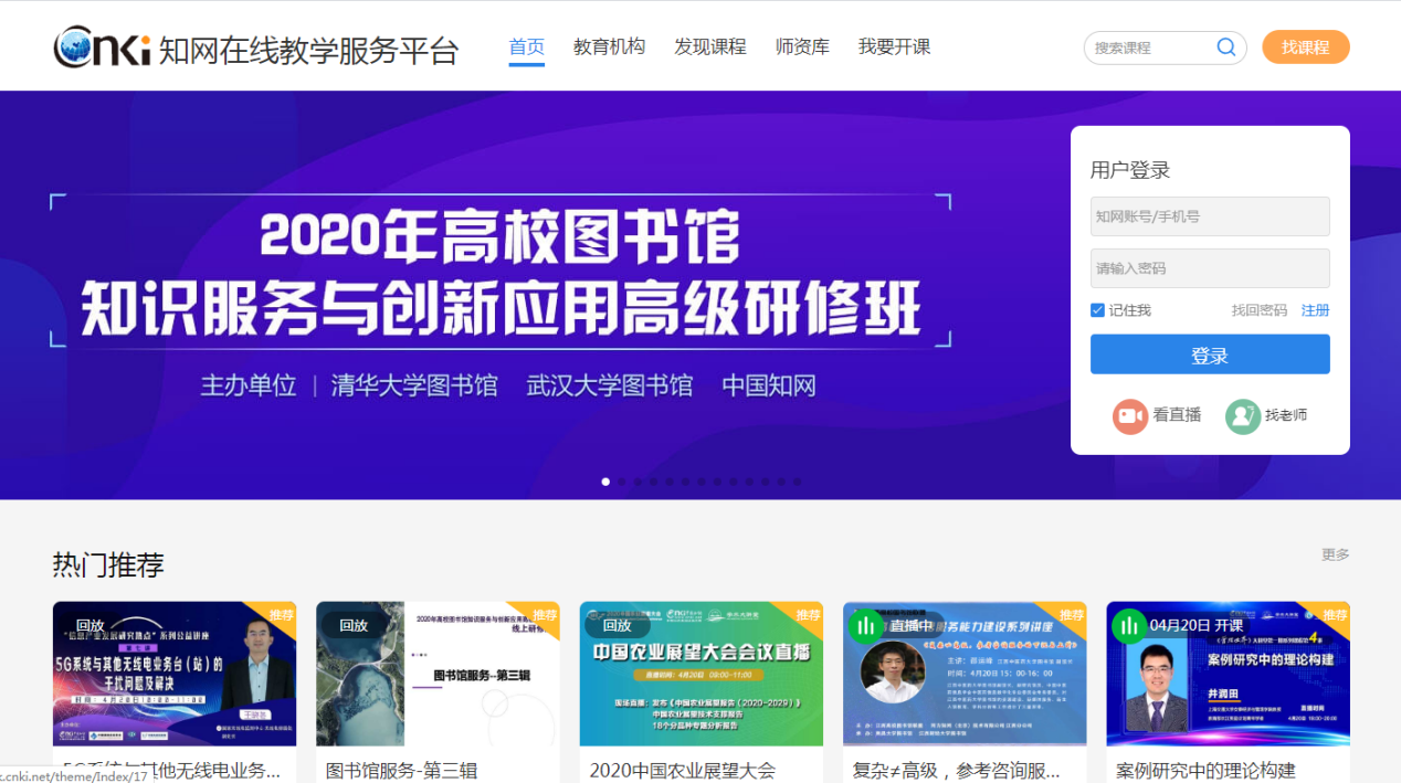 针对学校线上教学活动的需求,中国知网推出知网在线教学服务平台。 在疫情期间,读者注册账号可以免费使用该平台,满足教育系统“停课不停教、停课不停学”的需要。