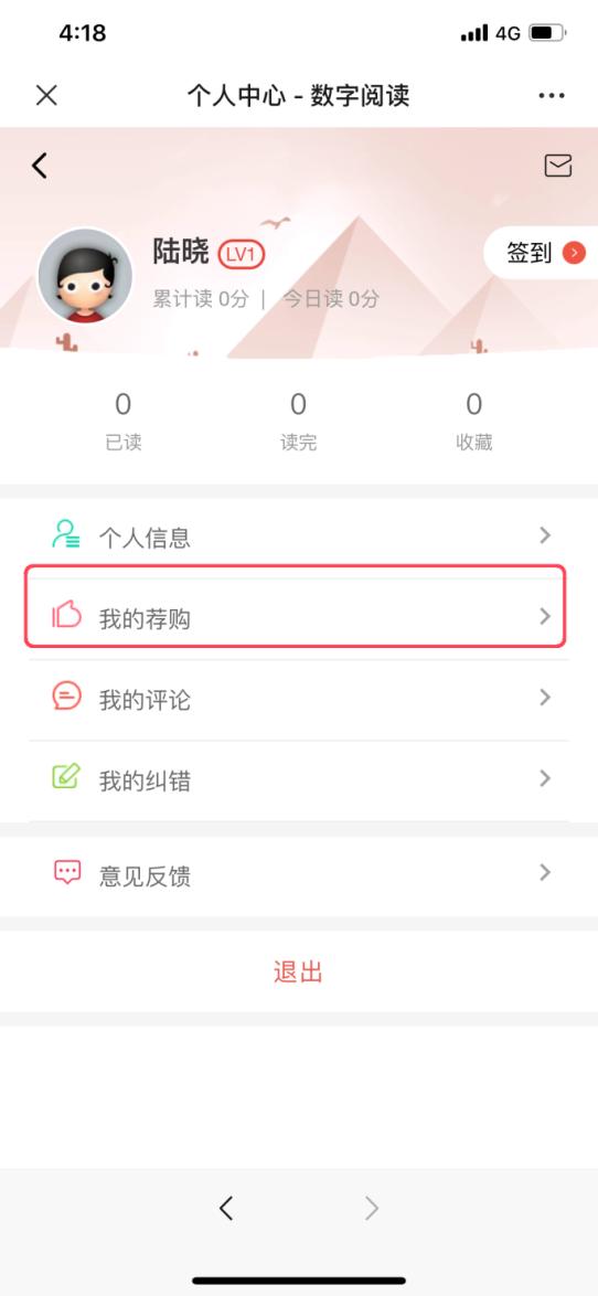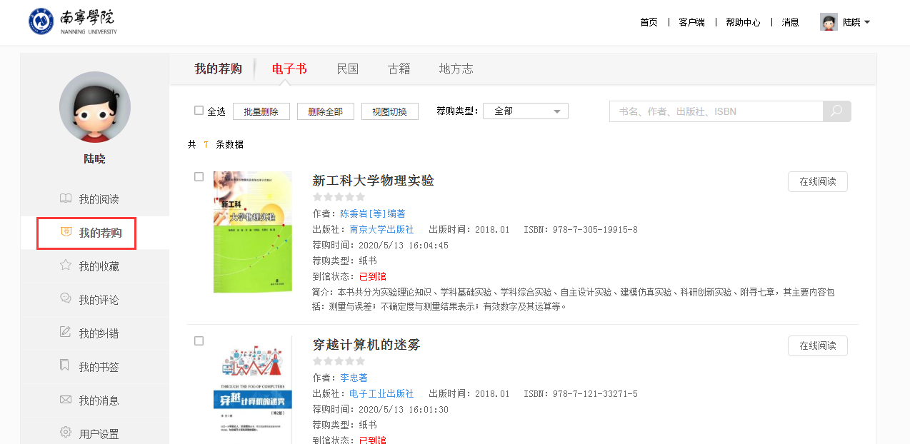 5.在“个人中心”——“我的荐购”可以查看本人荐购的图书信息。