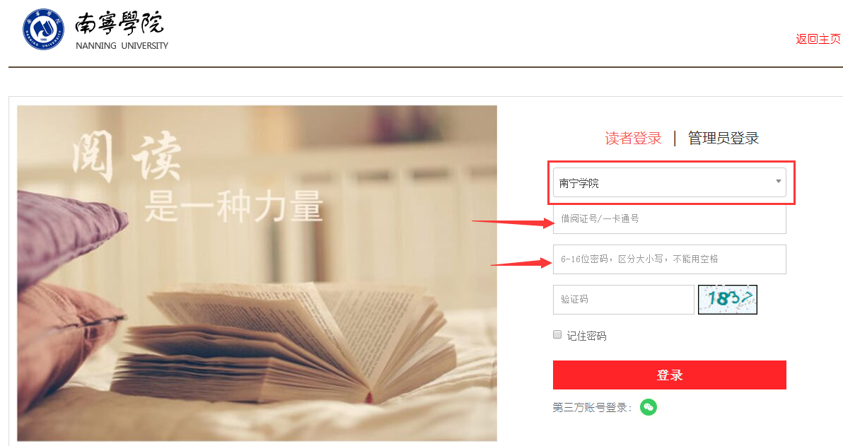 3.在“选择图书馆”列表中选择“南宁学院”,输入本人一卡通账号,初次登录密码为:123456。请务必使用本人一卡通账号和密码登录,不要绑定微信账号登录。遇到一卡通账号和初始密码无法登录请联系图书黄丽茵老师,电话:5900871。