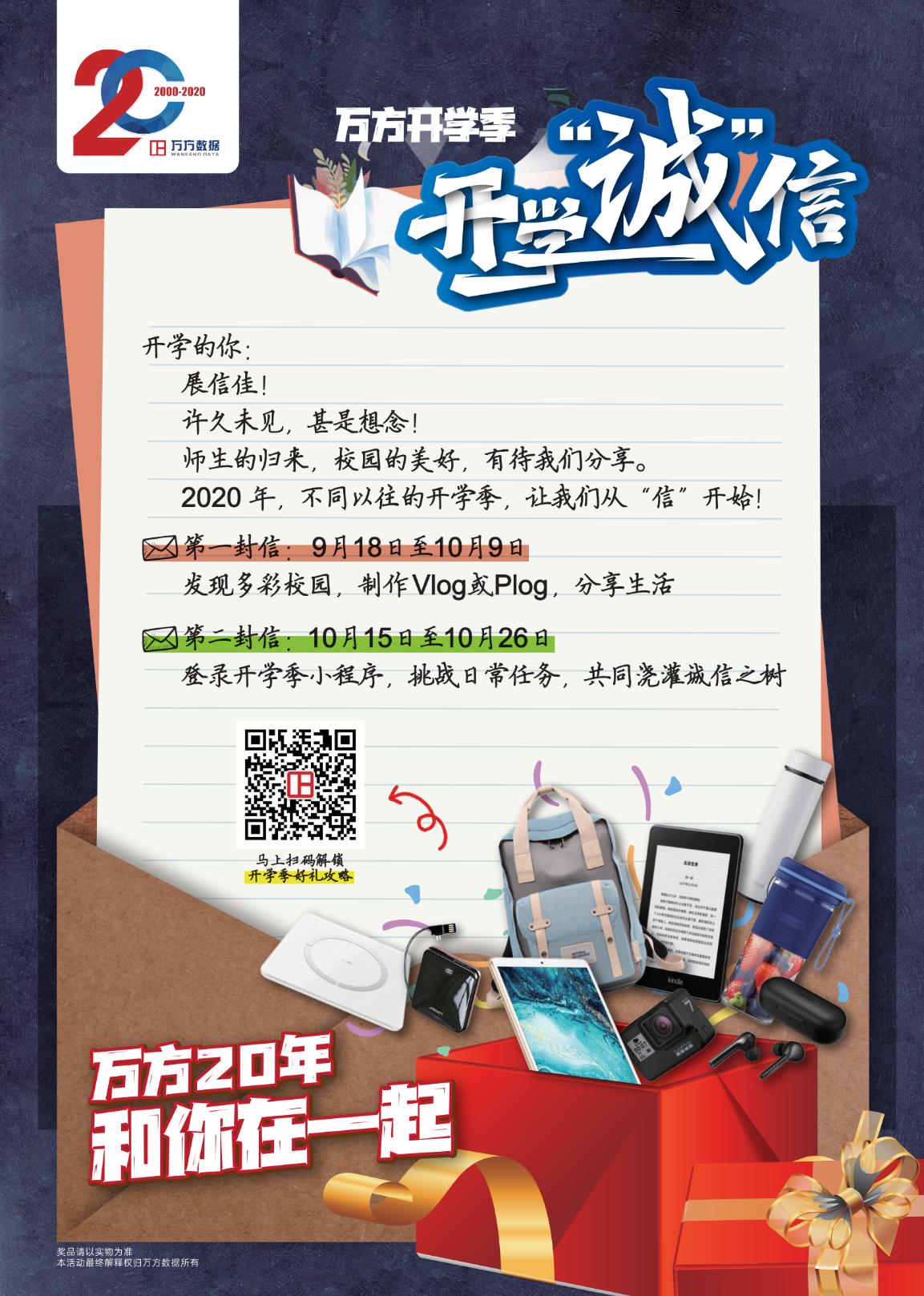 历经暑假,我们重返校园,有太多话想说。让我们从“信”出发吧!用Vlog & Plog记下你2020年的校园,发送给20岁的万方数据!今年让我们真诚互换开学影音信,开学季系列活动好礼随你拿!这个开学季,因你更精彩!
