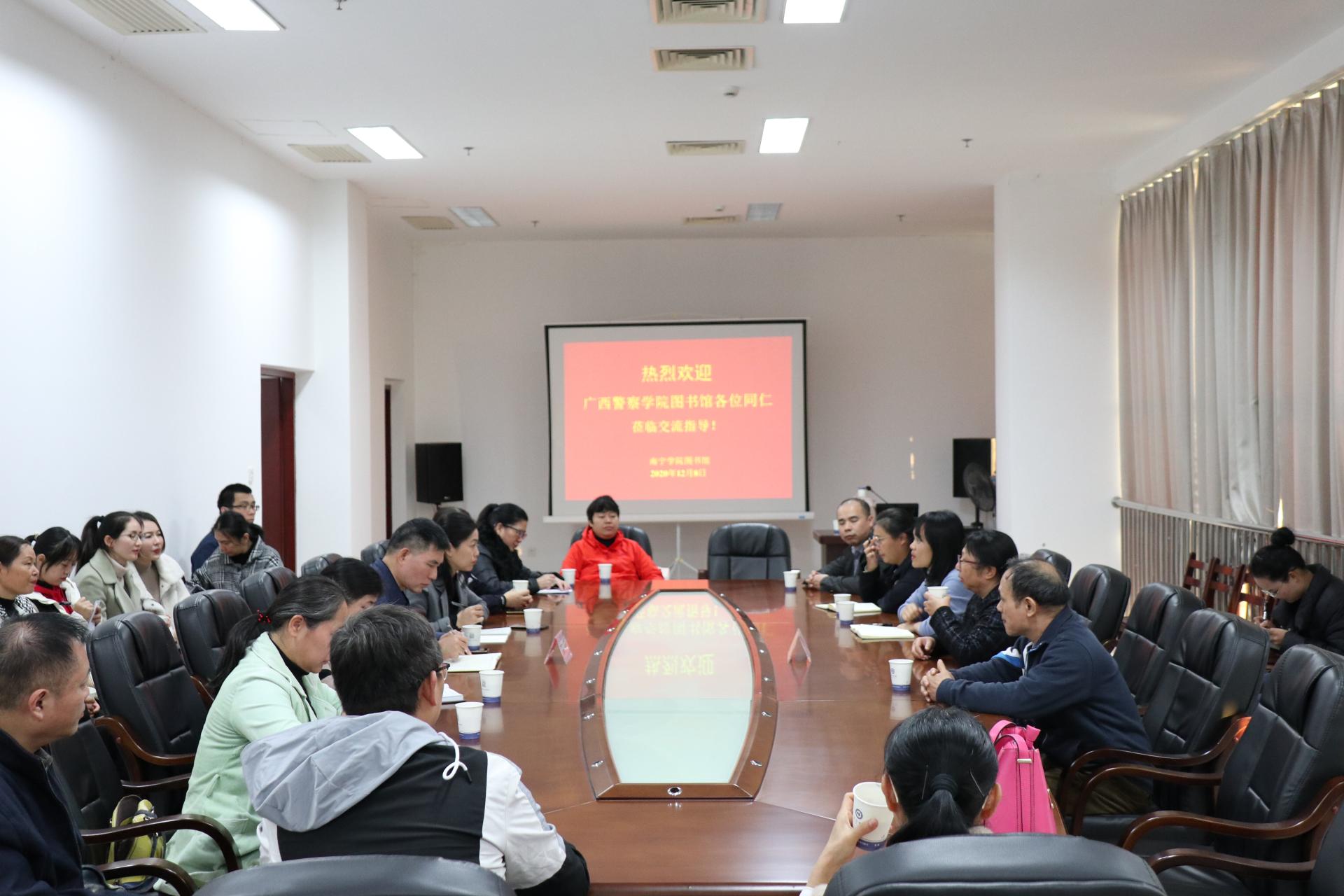 2020年12月8日下午,广西警察学院图书馆馆长朱小根等一行到我校图书馆进行参观交流。谢清馆长及馆内各科部负责人、馆员对他们的到来表示热烈欢迎,并与朱小根馆长一行在图书馆八楼会议室进行了交流座谈。大家就本科合格评估中图书馆评估的具体内容和评估标准、图书馆资源文献建设以及馆内规范管理经验等情况进行交流探讨。