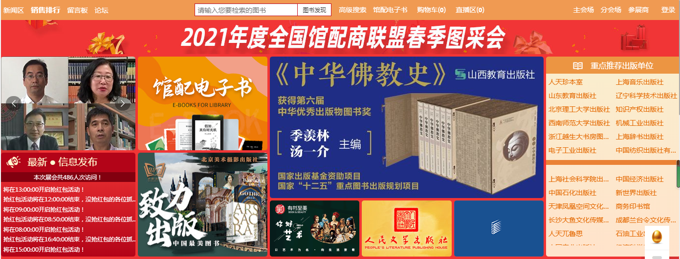 2021全国馆配商联盟春季图采会采用线上订购的模式,广大师生可以足不出户“云采书”,届时平台将展示500多家出版单位全品种图书、二十余万种新书资源,更有多场主题论坛、出版社直播活动等待大家参与。