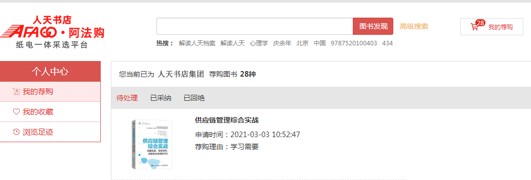 4、我的荐购:【个人中心】→【我的荐购】 中可查看到所有的荐购书目,及图书馆的采纳情况。