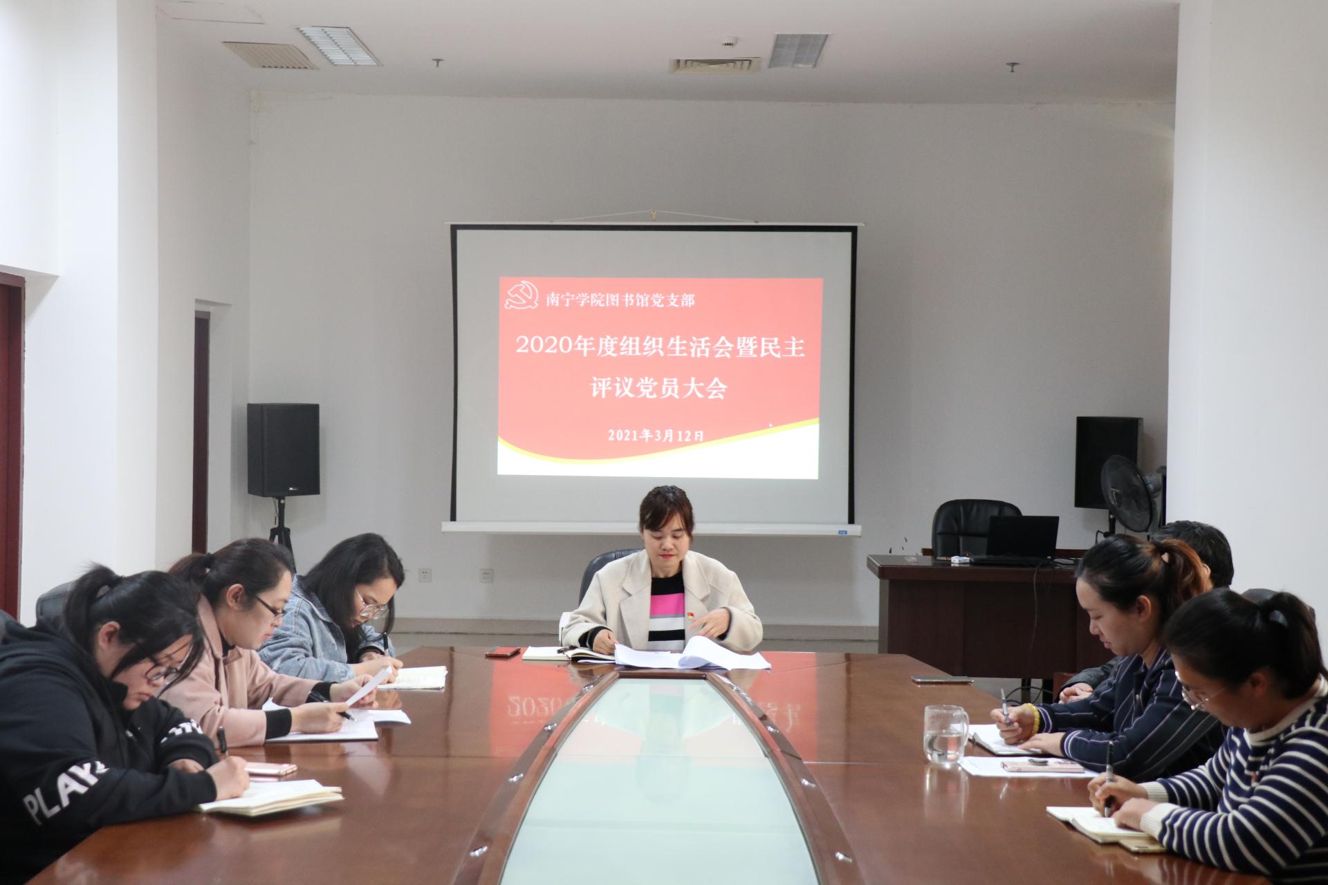 2021年3月12日上午,图书馆党支部在图书馆八楼会议室召开2020年度组织生活会暨民主评议党员大会。全体党员参会,会议由党支部书记梁敏主持。