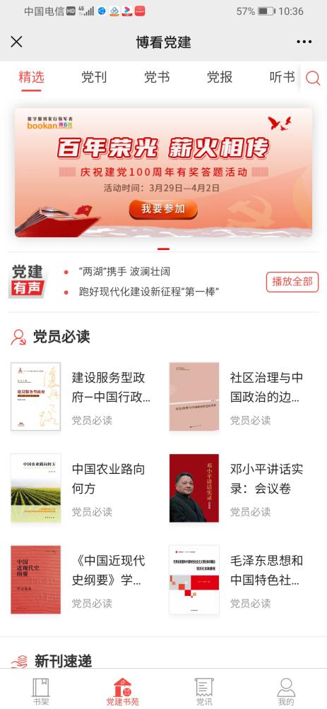 2、点击底部菜单栏“本馆资源”—“博看党建”,进入博看党建云阅读平台,点击首页活动轮播图“百年荣光 薪火相传—庆祝建党100周年有奖答题活动”,进入活动页面浏览党的百年历程大事件,点亮有奖答题活动入口,参与线上知识竞答。