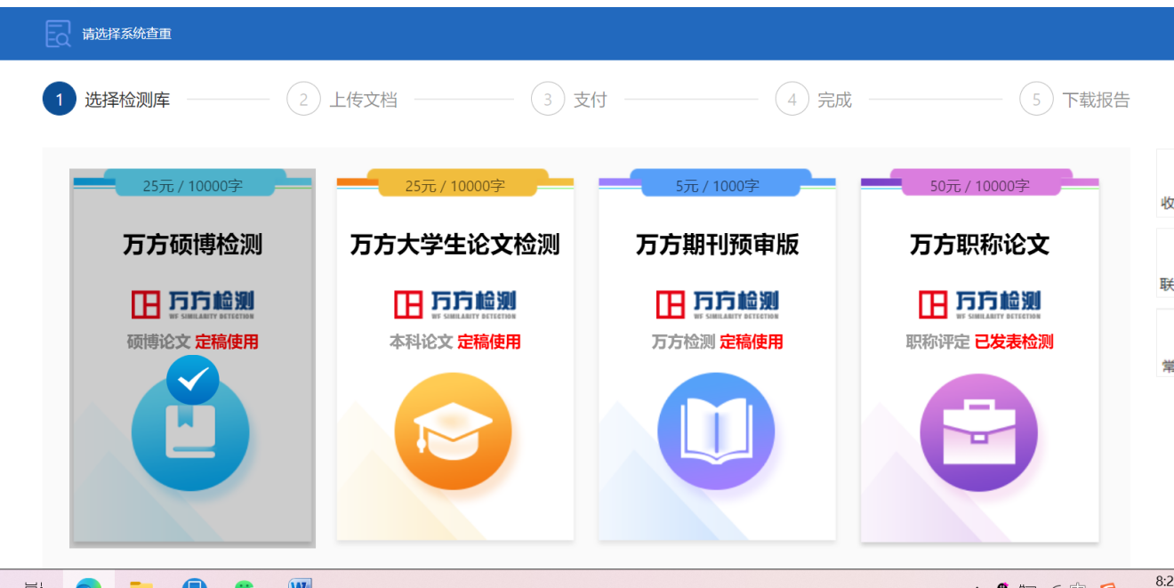 选择检测库→上传文档→支付→完成→查看(下载)检测报告