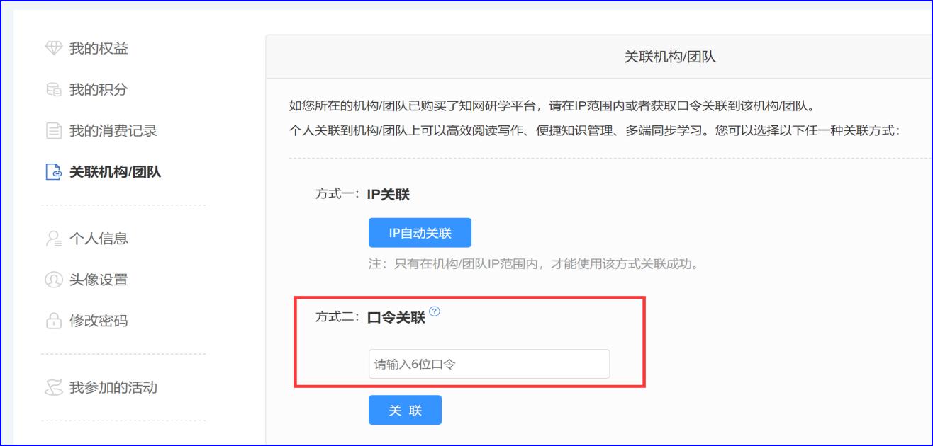登陆成功后,点击右上角的头像,进入个人中心,点击左侧的“关联机构/团队”在方式二里,输入学校的口令:9EGTKK