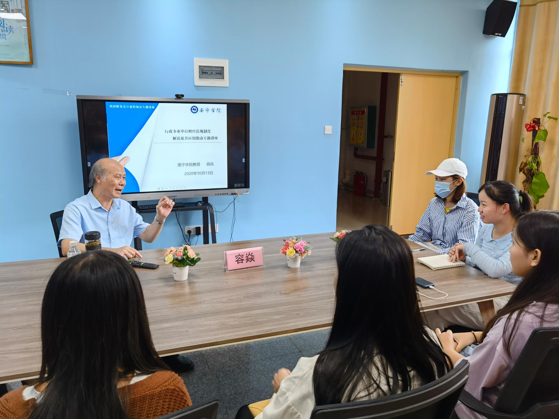 本次学科教授以讲座的形式进行,容教授首先欢迎学生们参与并阐述了本场讲座的选题的原因,是由于会计专业学生所学的专业知识偏重于企业会计领域,对行政事业会计领域专业知识存在短板。本场讲座内容包括两个方面:行政事业性国有资产管理核算规则、《政府会计制度》解读及其使用指南。