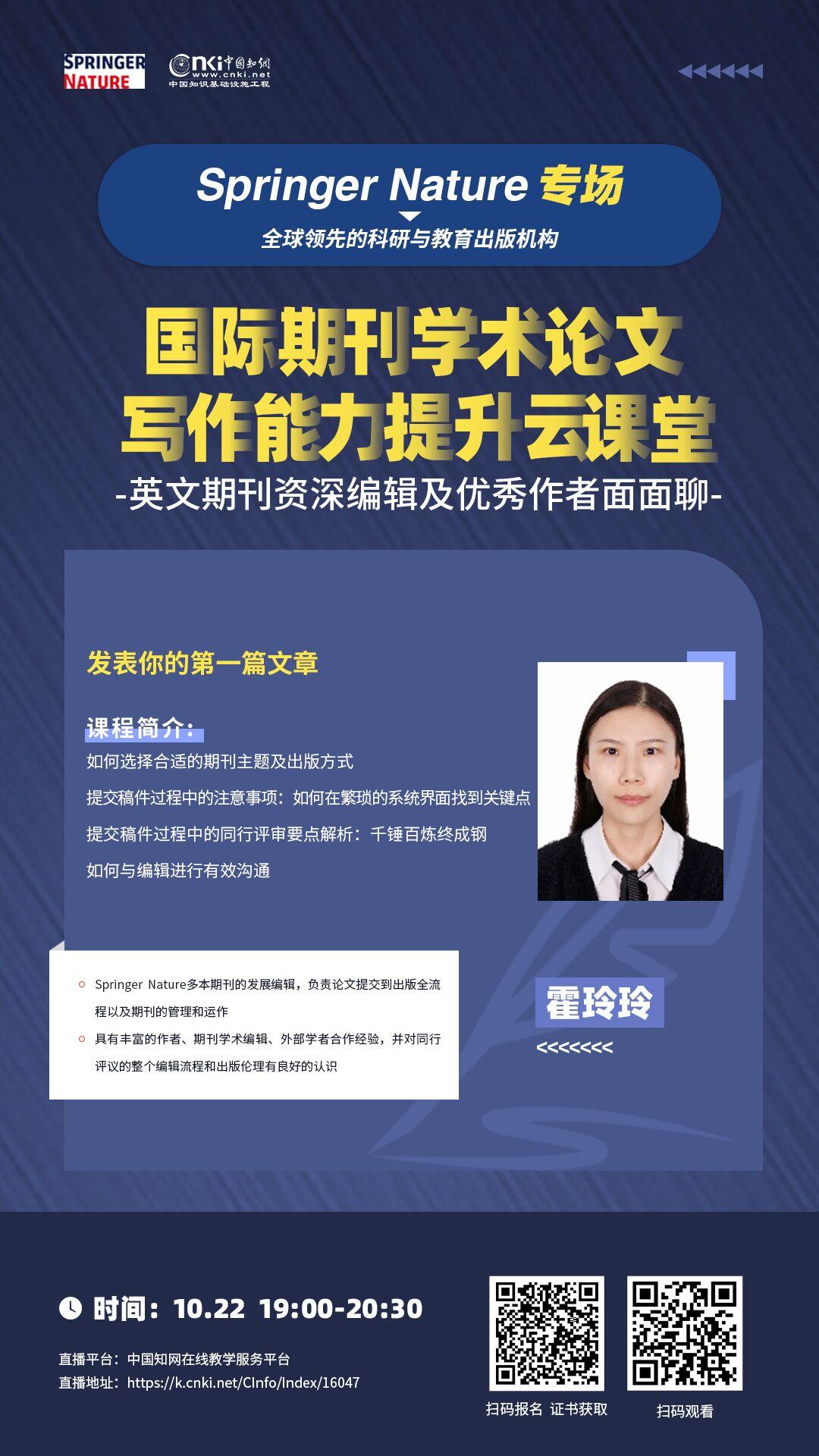 中国知网即将开展新一期线上讲座,本次主题为《国际期刊学术论文写作能力提升云课堂》,直播时间为10月22日-11月15日(共5讲),观看完成可获得电子版证书,欢迎大家参与!