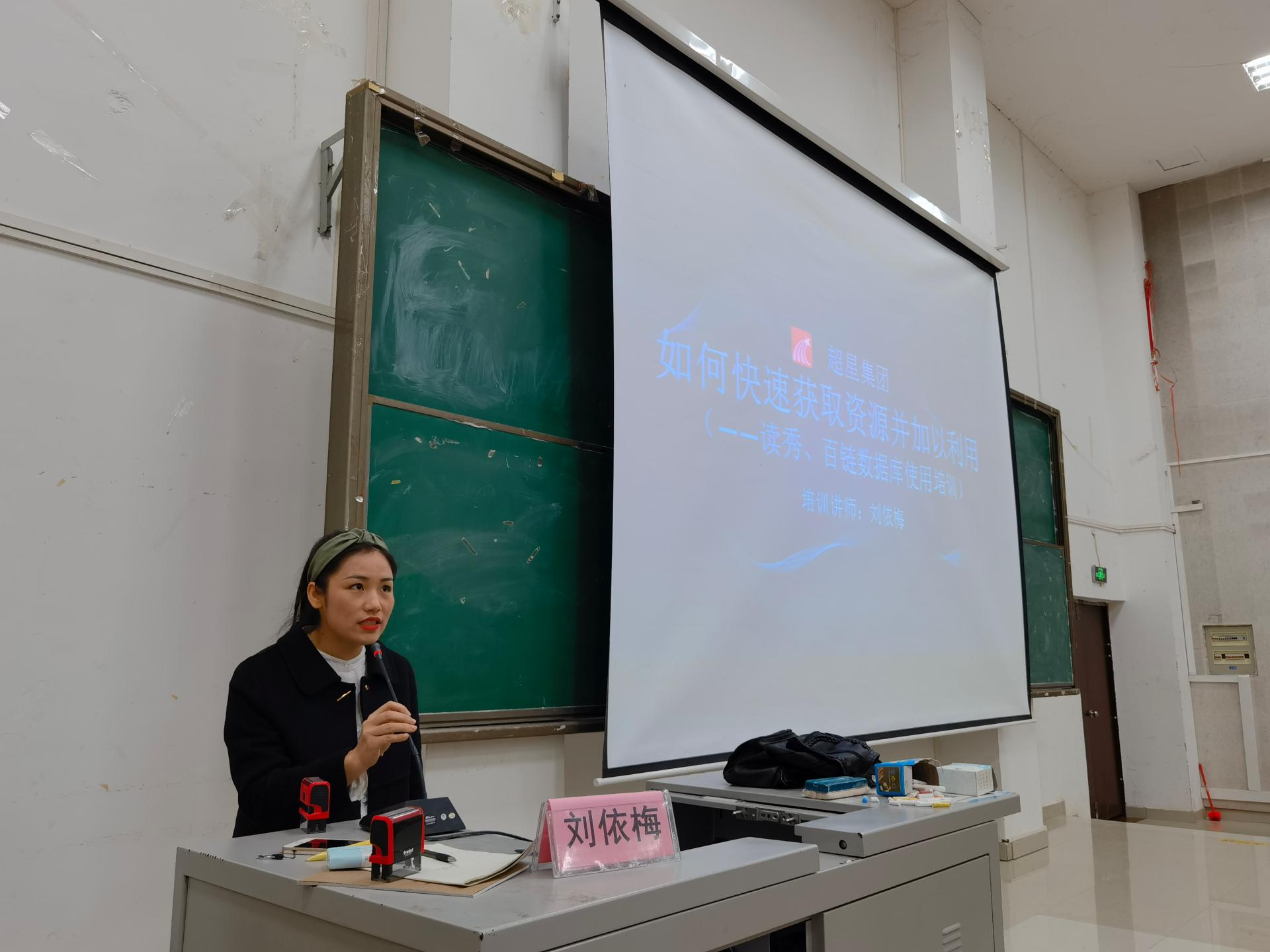 为了帮助同学们进一步了解读秀学术搜索、百链数据库,拓宽学术资源获取渠道。11月23日18点30分,广西超星信息技术有限公司的刘依梅老师在敷文园C104教室开展主题为“如何快速获取资源并加以利用”的培训讲座,本次培训参与人数约400人。