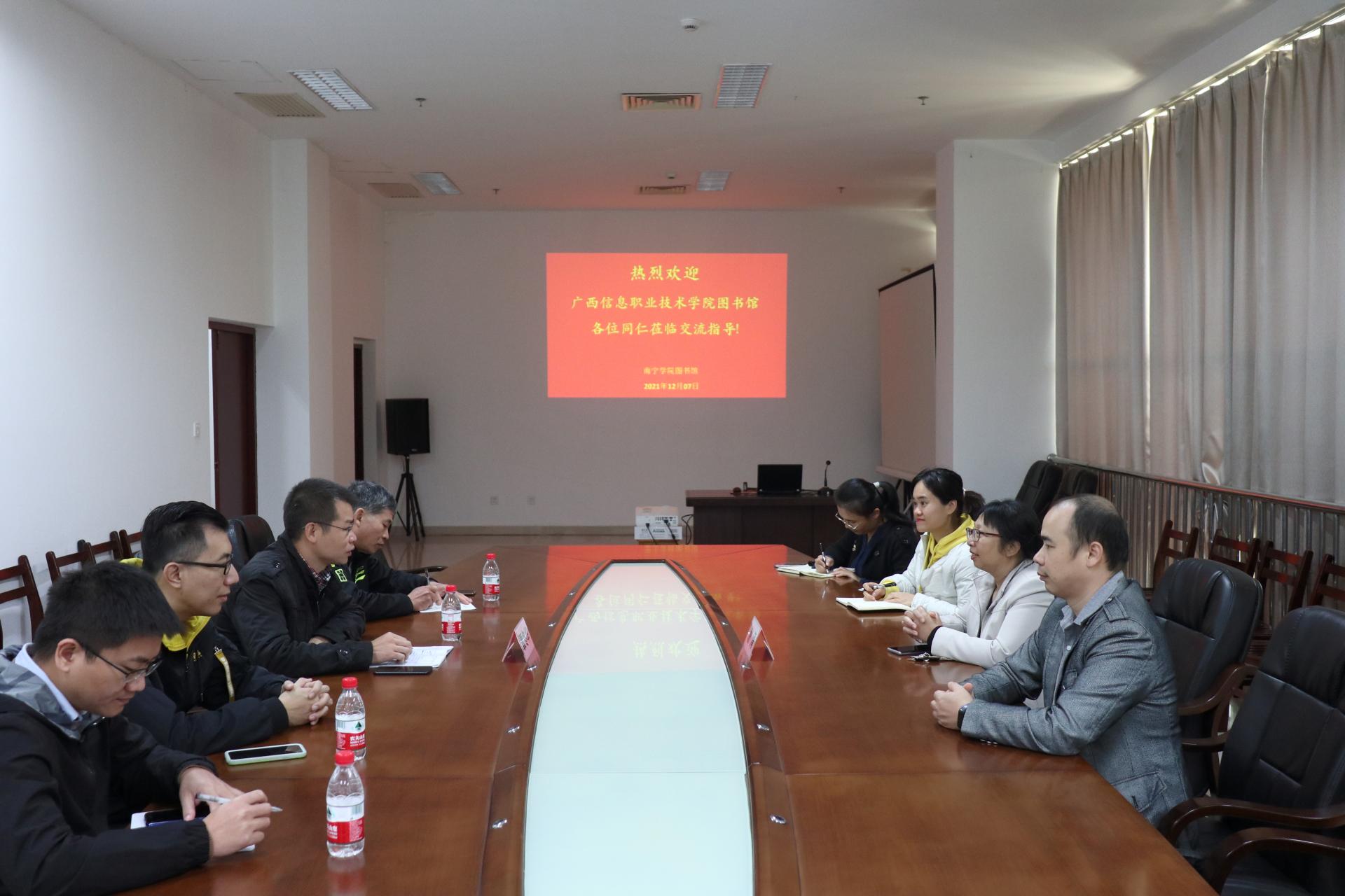 2021年12月7日上午,广西信息职业技术学院图书馆负责人覃冬华等一行4人到我校图书馆参观交流。谢清馆长及馆内各科部负责人对他们的到来表示热烈欢迎,并带领客人们从图书馆2楼开始进行参观,在参观过程中,谢馆长介绍了图书馆的整体馆藏布局情况以及图书馆的特色、亮点等。