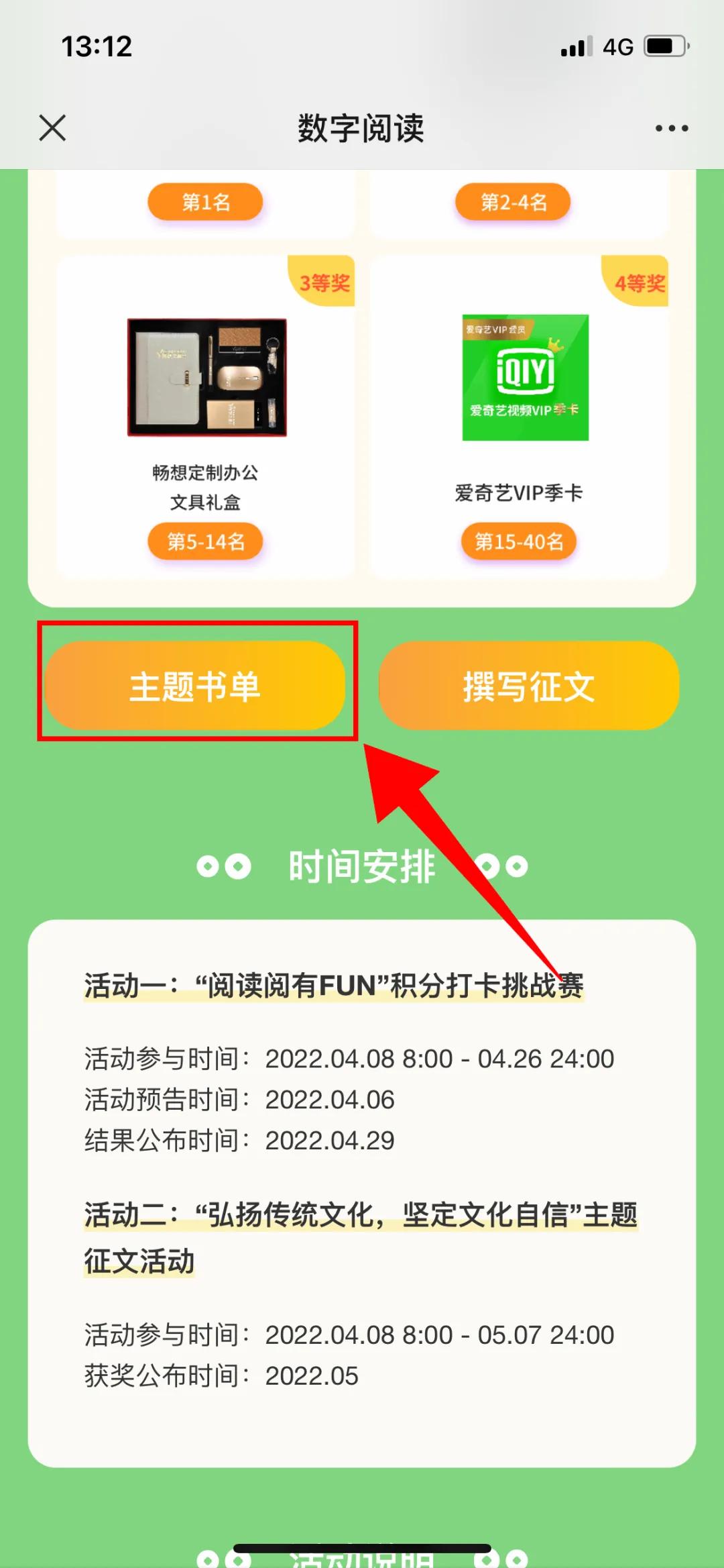 点击活动页面的【主题书单】→进入书单展示页面→上下滑动查看全部书单→点击喜欢的电子书进行阅读。