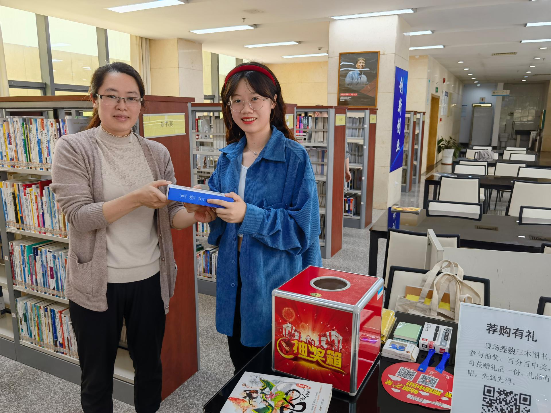 本次新书展展出专业图书、畅销图书2千多册,供师生读者借阅,读者选中的新书经工作人员现场加工后即可借阅。活动现场同时开展“荐购有礼”图书推荐会,读者现场扫二维码推荐3种图书,即可参与抽奖,有机会获得手持风扇、文具盲盒、笔记本等精美礼品,有效带动了读者参与的积极性。