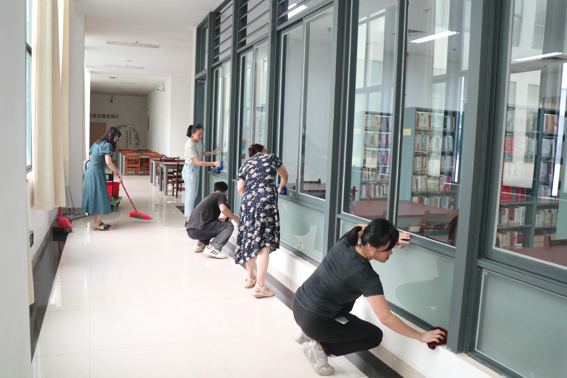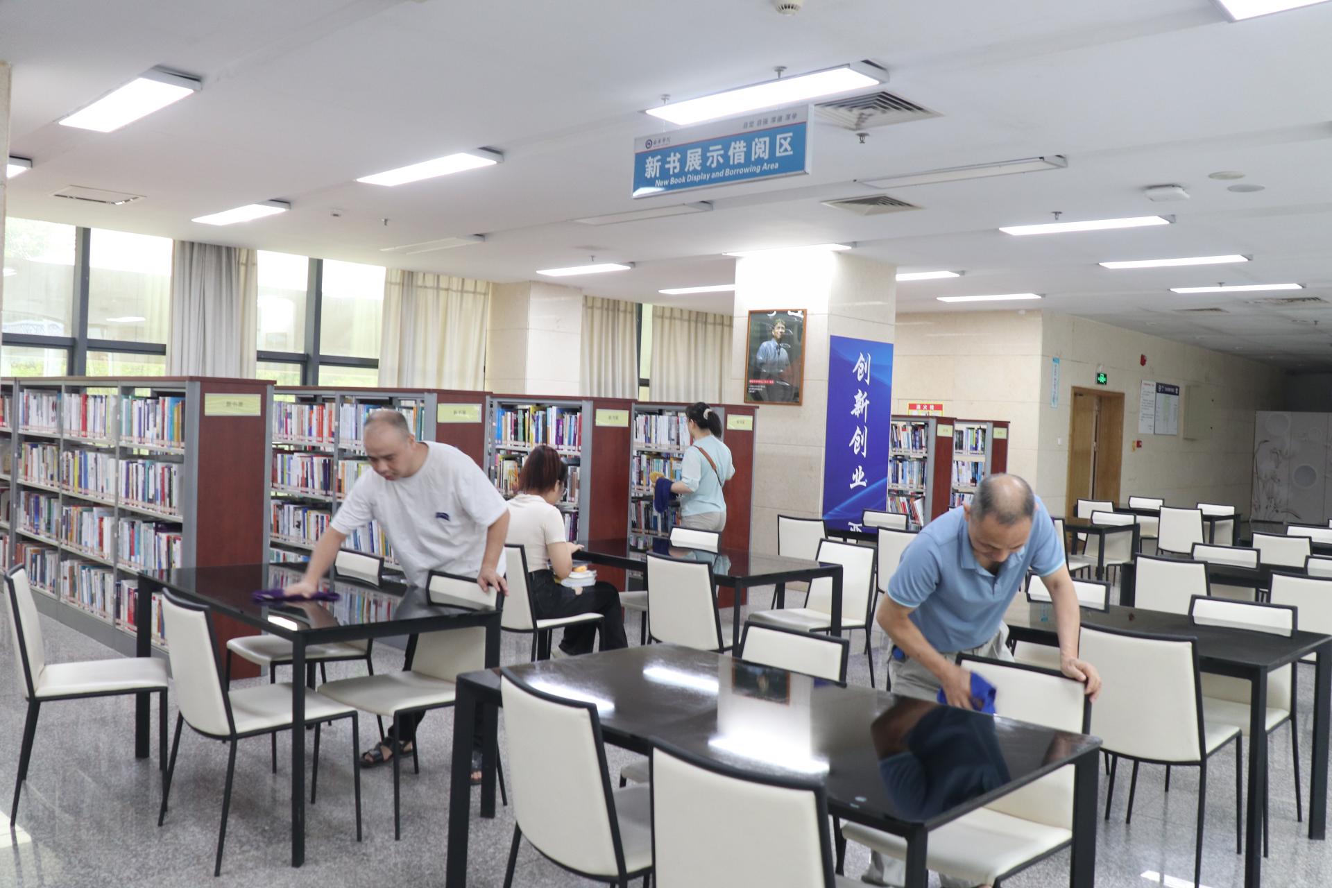 2023年8月29日-30日,图书馆组织全体馆员对各借阅室、阅览区、自习室等桌椅、书架、玻璃、地面、墙角区域进行全面清扫,不留卫生死角。在清扫过程中,大家不怕脏不怕累,分工合作,积极配合,有条不紊地开展清洁工作。经过两天的清扫后,图书馆窗明几净,环境焕然一新,并将于8月31日起正常开馆,全体馆员期待读者们的到来。(图/文 黄丽茵)