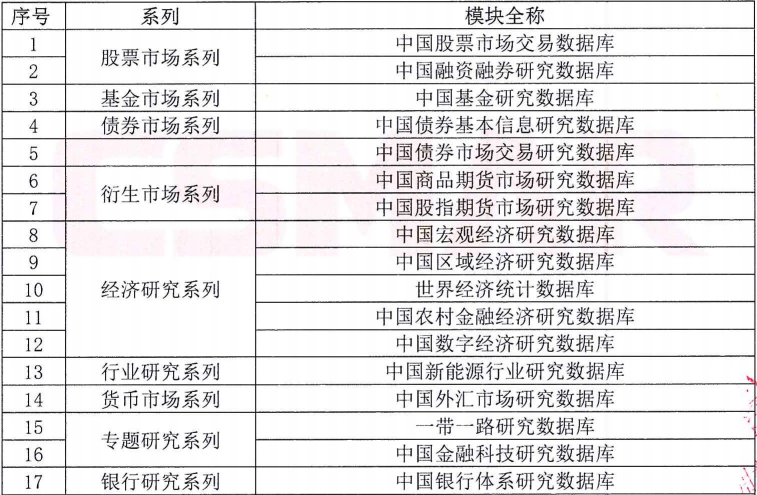 内容:将数据库分为股票、公司、基金、债券、衍生、经济、行业、海外、资讯系列数据库。涵盖中国证券、期货、外汇、宏观、行业等经济金融主要领域的高精准研究型数据库,是投资和实证研究的基础工具。