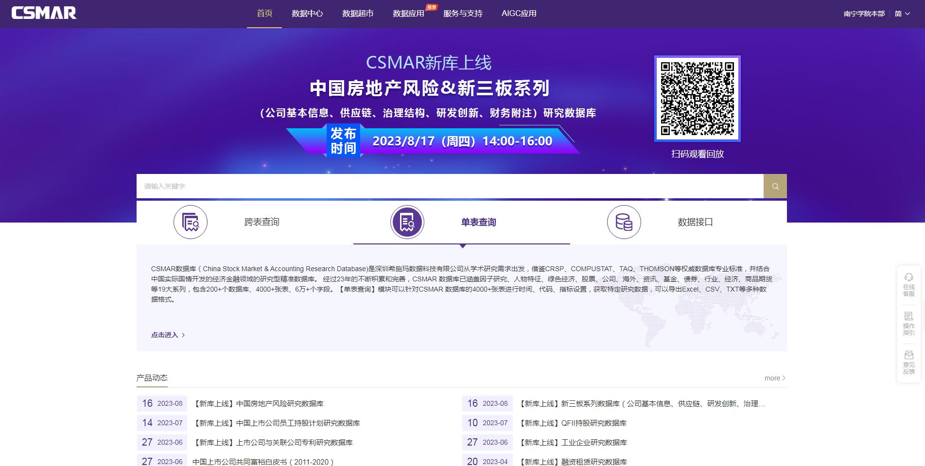 希施玛CSMAR 数据库是经济金融领域的研究型精准数据库,涵盖因子研究、人物特征、绿色经济、股票、公司、海外、资讯、基金、债券、行业、经济、商品期货等19大系列,包含200+个数据库、4000+张表、6万+个字段。