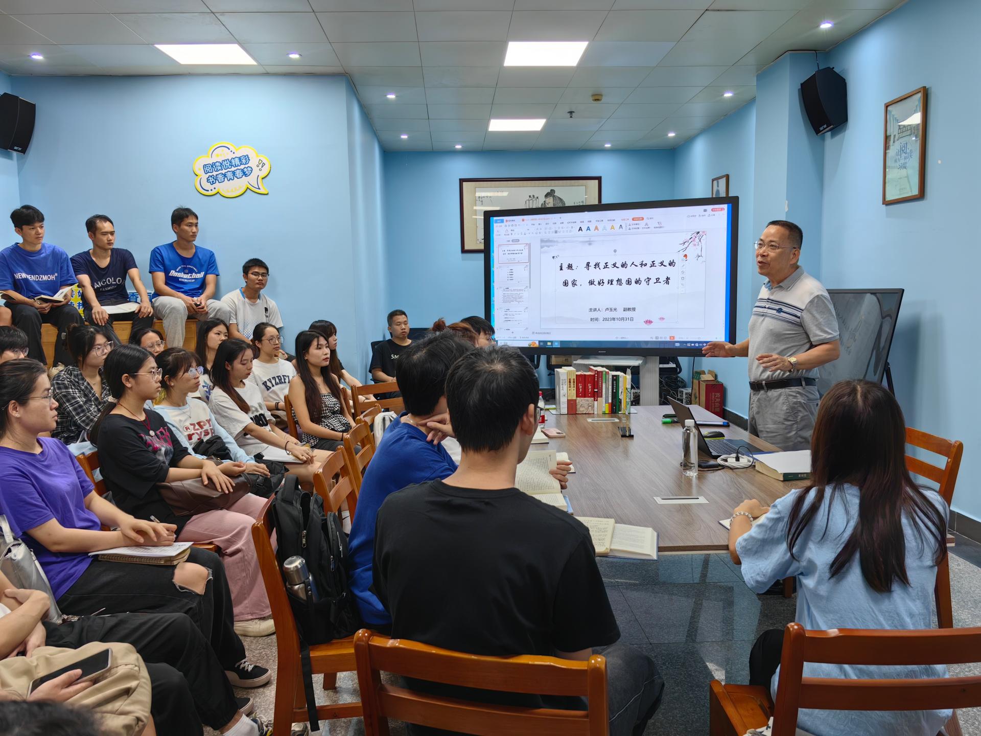 活动中,卢副馆长着重介绍了《理想国》的背景,从柏拉图、苏格拉底、亚里士多德拓展到孔子和墨子等哲学家及代表人物的理念,通过思维维度、辐辏和河流、思想的重合与碰撞等知识简点,将东、西方哲学作对比,以导读的形式与在场师生共读《理想国》。接着,围绕该书第四卷的内容、问题和观点,进行师生分享。现场同学积极思考,并踊跃发表了自己的看法。