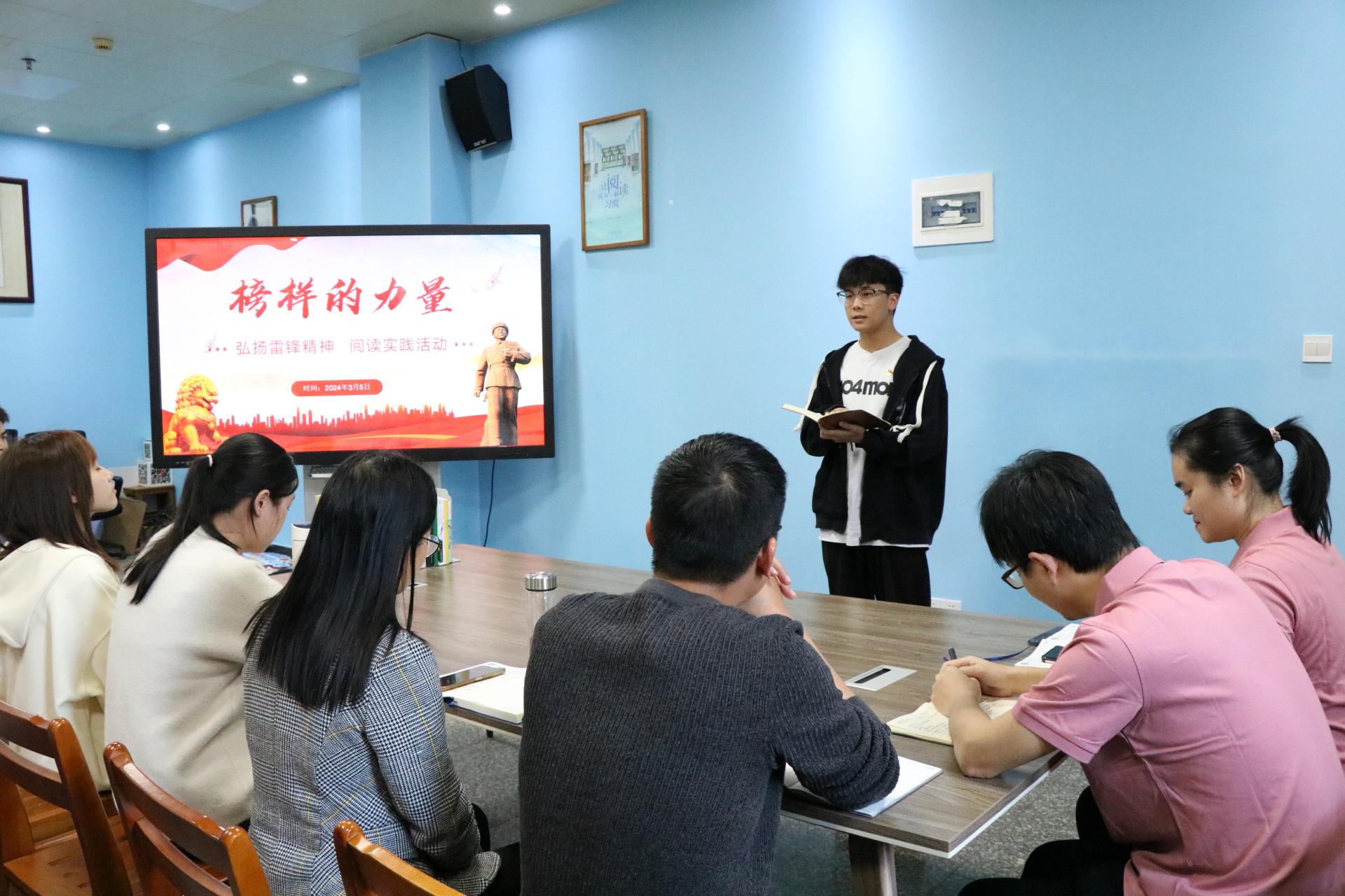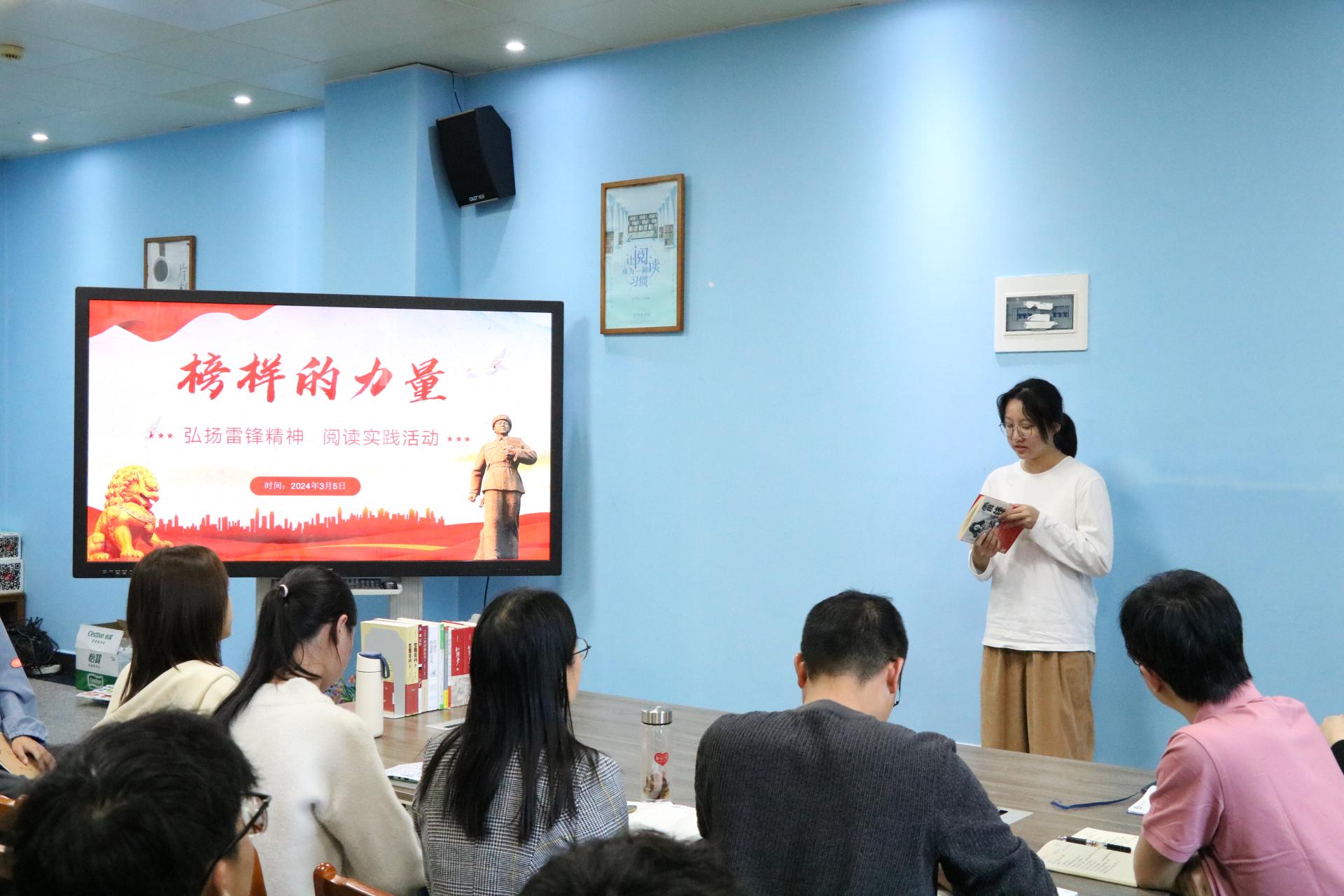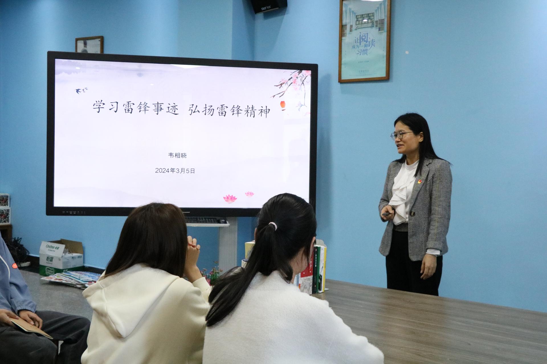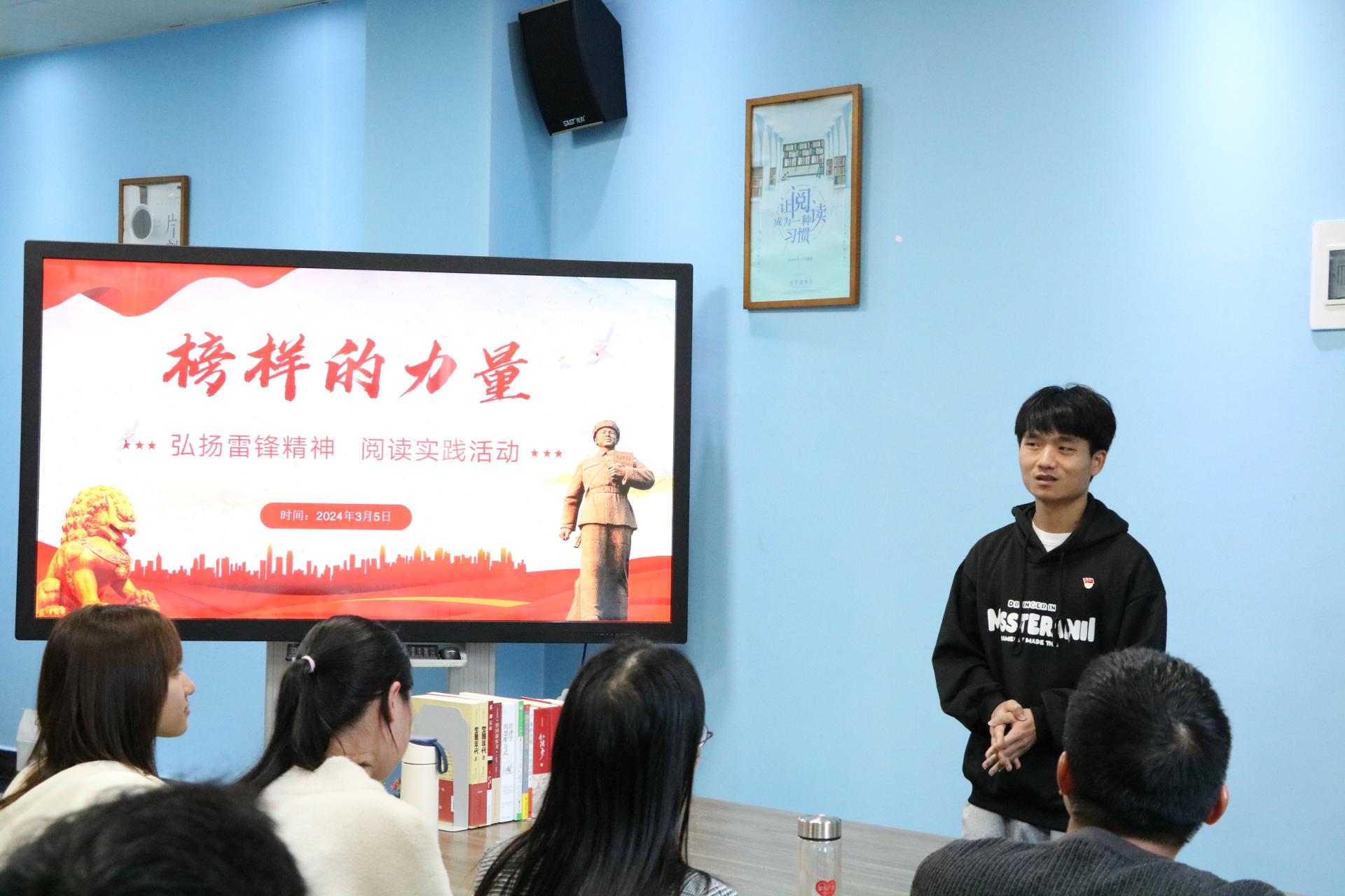 活动于2024年3月5日在图书馆二楼阅读分享空间开展。活动伊始,主持人先用一段介绍雷锋同志生平事迹的视频引出主题。接着,图书馆党支部书记韦相晓带领大家深入学习雷锋精神,通过对雷锋简介、雷锋精神、如何践行雷锋精神三个方面的详细讲解,带领大家了解雷锋同志的感人事迹,领悟雷锋精神的主要内涵,思考新时代青年、共产党员如何践行雷锋精神。韦书记强调,新时代青年尤其是共产党员要深刻把握雷锋精神的时代内涵,要学习雷锋同志忠于党和人民、舍己为公、大公无私的奉献精神,立足本职、在平凡的工作中创造出不平凡业绩的"螺丝钉精神";苦干实干、不计报酬、争做贡献的艰苦奋斗精神。在日常生活中弘扬雷锋精神,践行互助、互爱、友善的优良作风,让雷锋精神在新时代绽放更加璀璨的光芒。