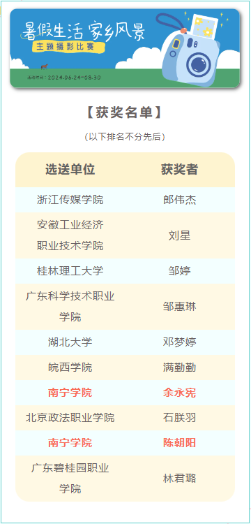 本次摄影比赛丰富了同学们的暑期生活,学校图书馆和设计师之家数据库通过摄影比赛吸引学生发掘家乡的美好风景,引导学生发现美、欣赏美、创造美,从而提升学生的艺术素养、文化情操和对家乡的热爱之情。本次活动将“五育并举”的“美育”理念融入学生学习生活中,引导学生树立正确的审美观念、陶冶高尚的道德情操,培养德智体美劳全面发展的社会主义建设者和接班人。(文/黄丽茵)