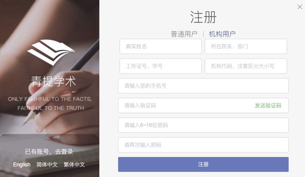 本校师生使用青提学术须进行机构用户注册,机构代码为“NNXY”,注册并在机构IP范围内认证成功后,方可享受本校拥有的机构特权。