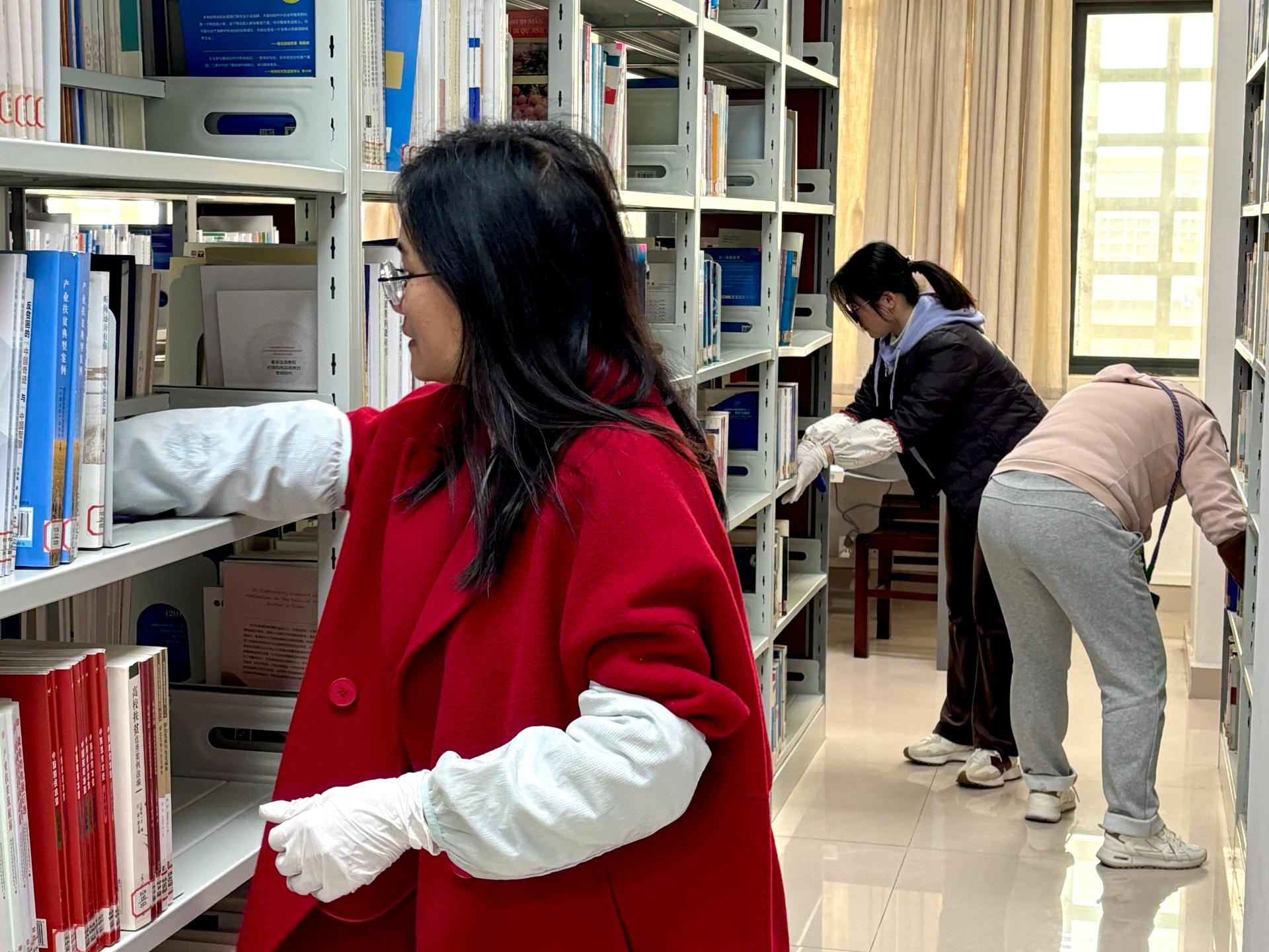 在馆领导的组织和带领下,全体馆员齐心协力,对图书馆的各个区域进行了彻底的清洁和整理。大家不畏脏乱,热情高涨,分工明确,配合默契,清洁工作井然有序。从二楼大厅到顶楼书库,从书架整理到地面清扫,每一个细节都得到了细致的关注。特别是针对读者高频使用的区域,如阅览室、自习区、借还书台等,馆员们进行了重点清理,确保每个角落都能焕然一新。