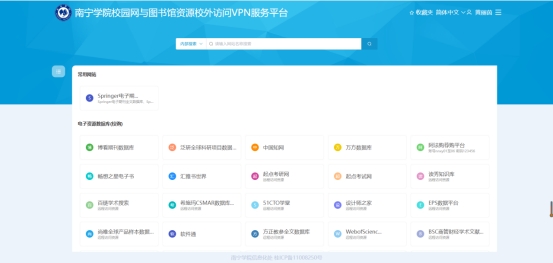 南宁学院官网首页“一网通办”,使用个人微信扫码登录,点击“南院VPN”,在VPN界面点击需要访问的电子资源,即可使用。