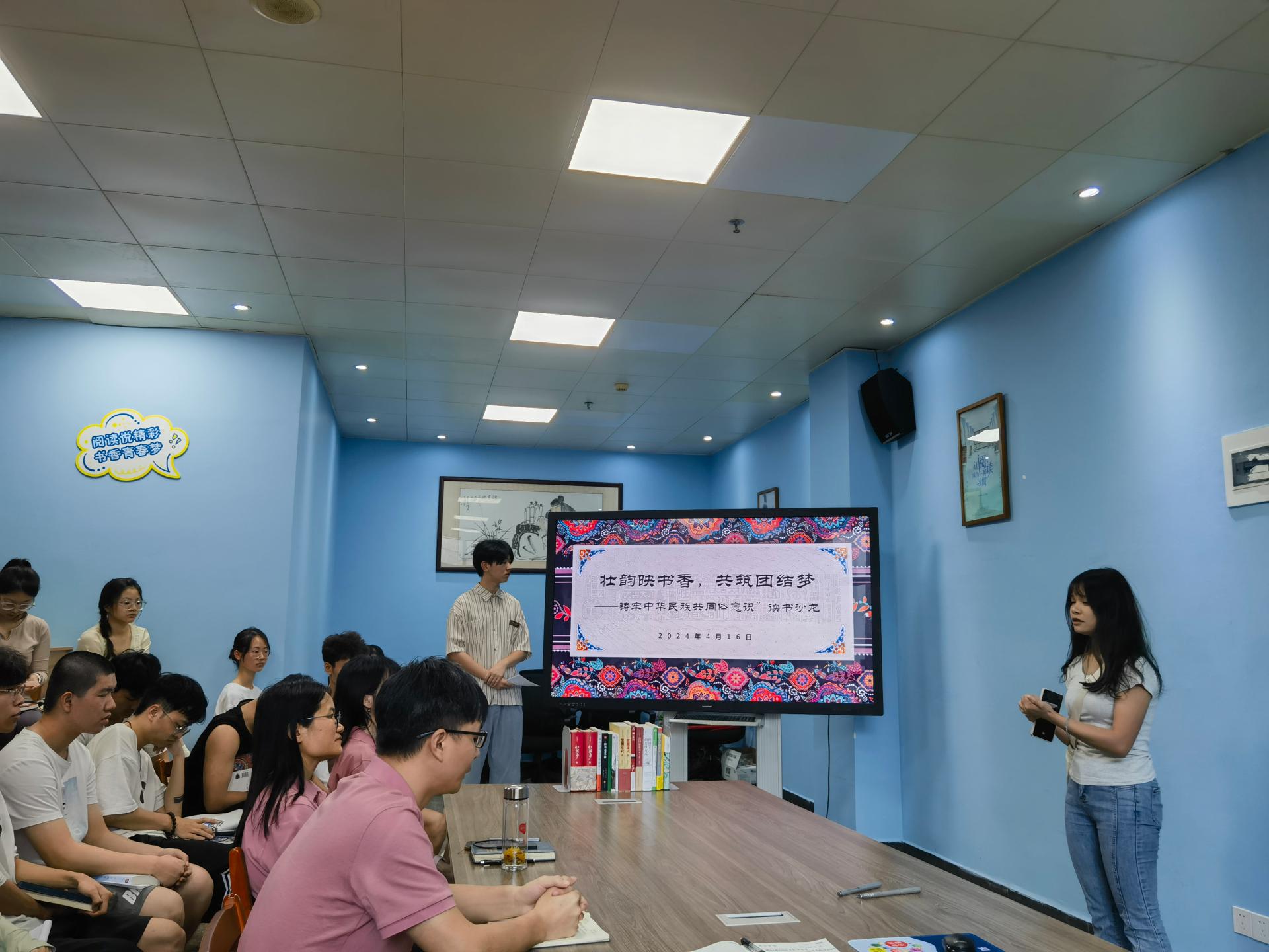 为深入贯彻习近平新时代中国特色社会主义思想和党的二十大精神,深化校园民族团结进步教育,传承弘扬中华优秀文化,坚定文化自信,铸牢中华民族共同体意识,2024年4月16日,图书馆党支部在图书馆二楼阅读分享空间开展主题为“壮韵映书香,共筑团结梦——铸牢中华民族共同体意识”的读书沙龙主题党日活动,数十名师生读者及图书馆党支部党员共同参与。